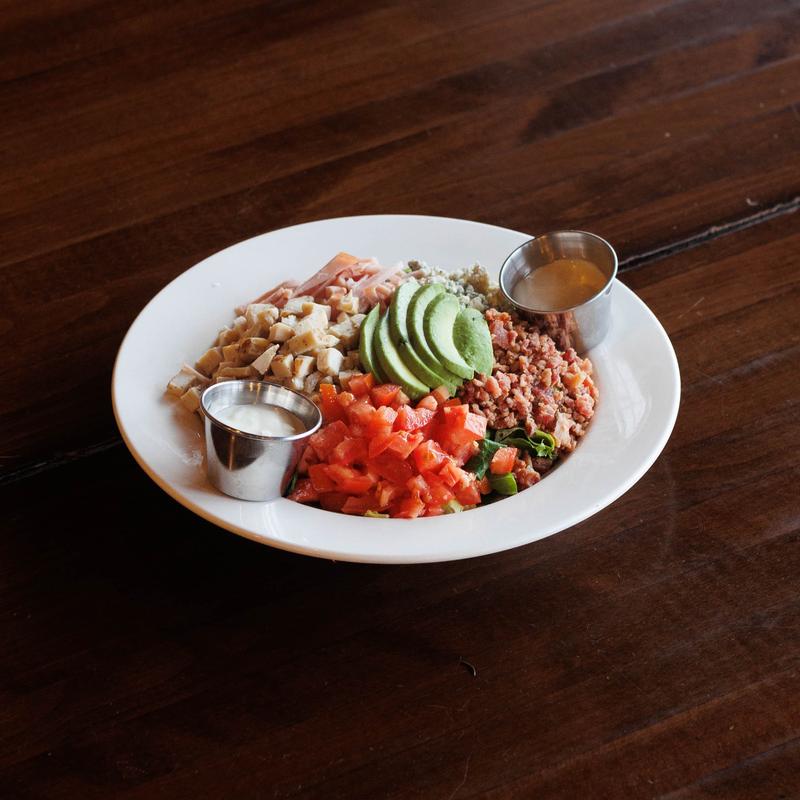 Chopped romaine, chicken, bacon, tomatoes, gorgonzola crumbles, diced avocado, croutons, and a choice of dressing.